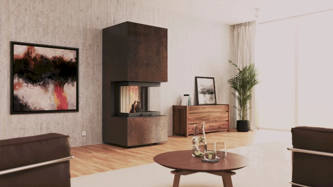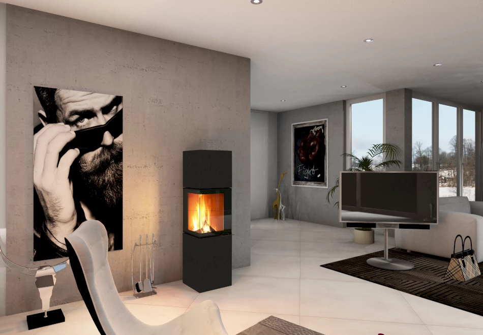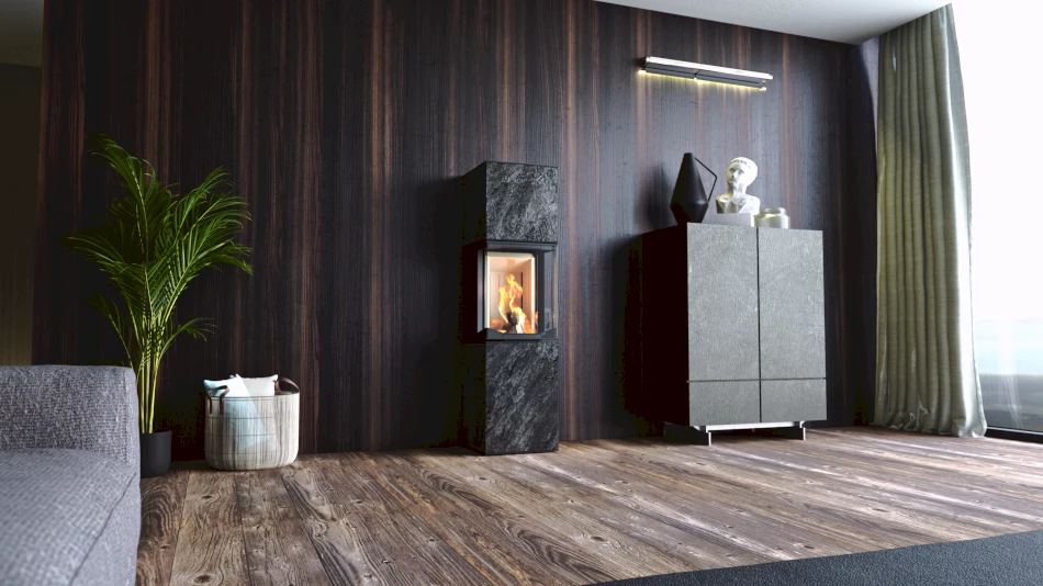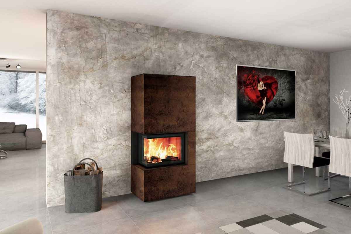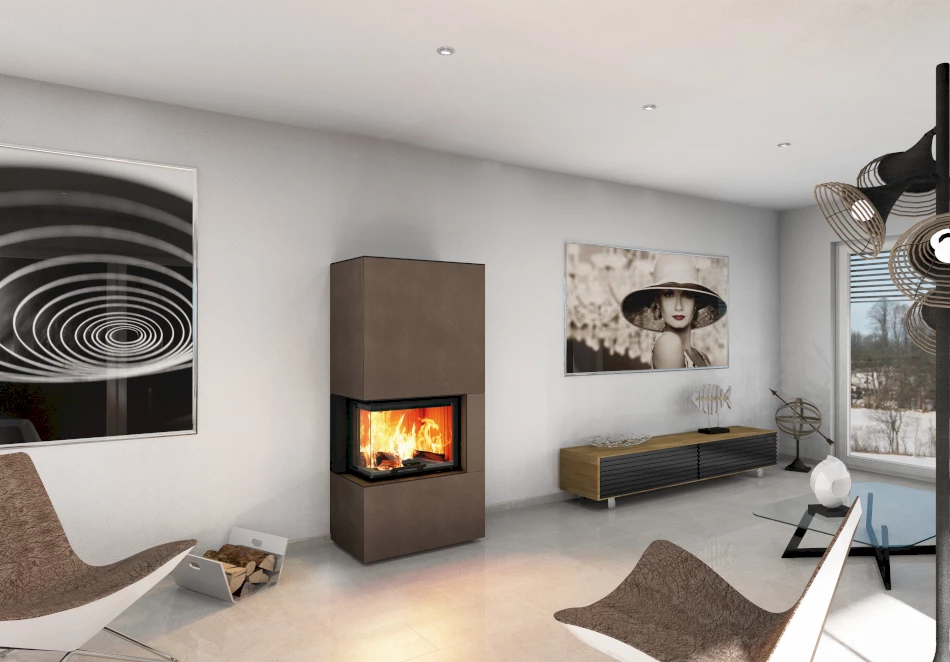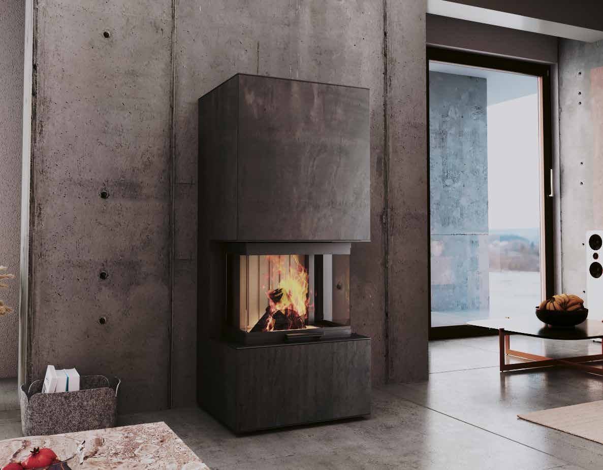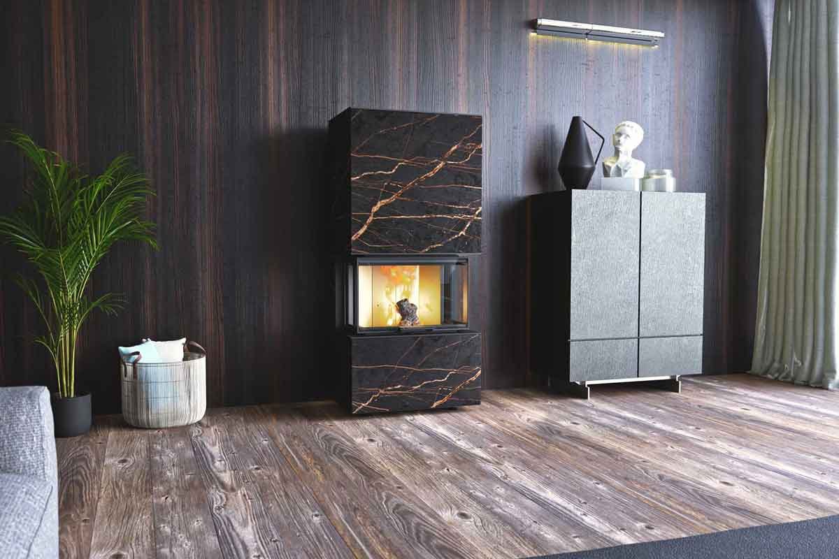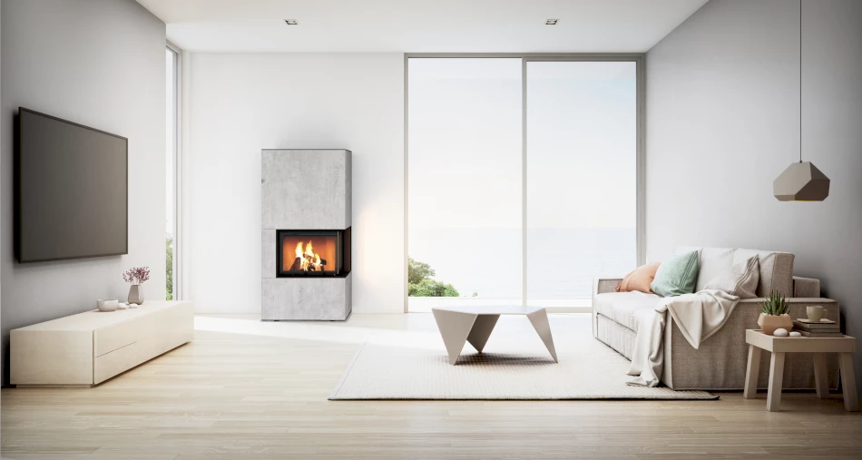Charakteristisch für Neocube sind die großformatigen Keramikverkleidungen der Kaminanlagen, die in unterschiedlichsten Farben und Texturen erhältlich sind und sich individuell an den Wohnstil anpassen lassen.