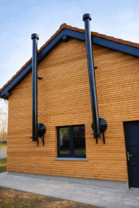 Doppelwandige Edelstahlschornsteine sind die häufigste Lösung für Kaminöfen in Bestandsgebäuden ohne vorhandenen Schornstein. Das System wird außen an der Fassade montiert und sorgt für sicheren Rauchabzug sowie optimale Zugverhältnisse.
