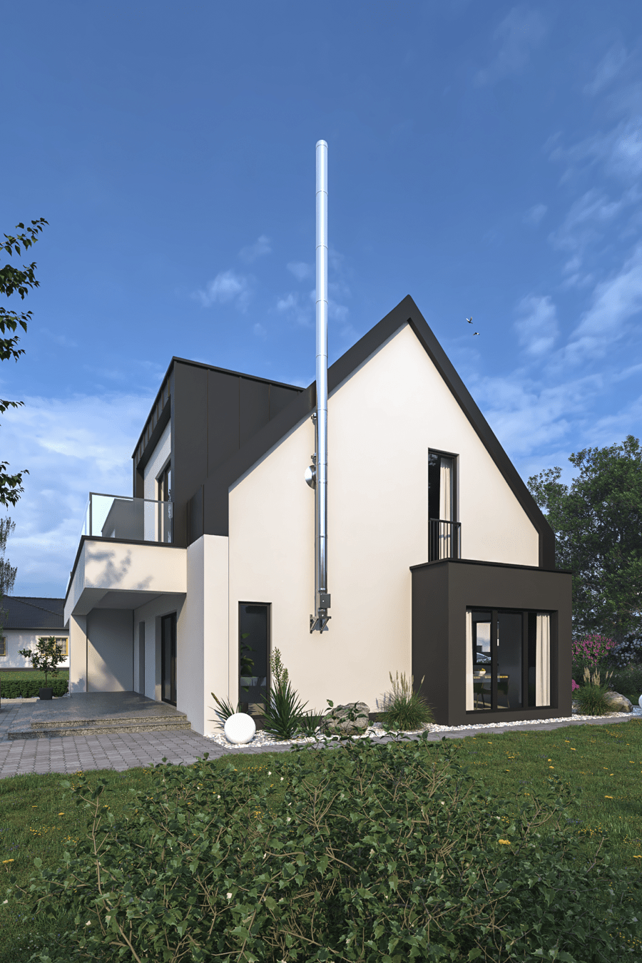 Pulverbeschichtete Edelstahlschornsteine passen sich optisch perfekt an Fassade oder Dach an. Die farbige Oberfläche macht den Schornstein deutlich unauffälliger und integriert ihn harmonisch in die Architektur des Hauses.
