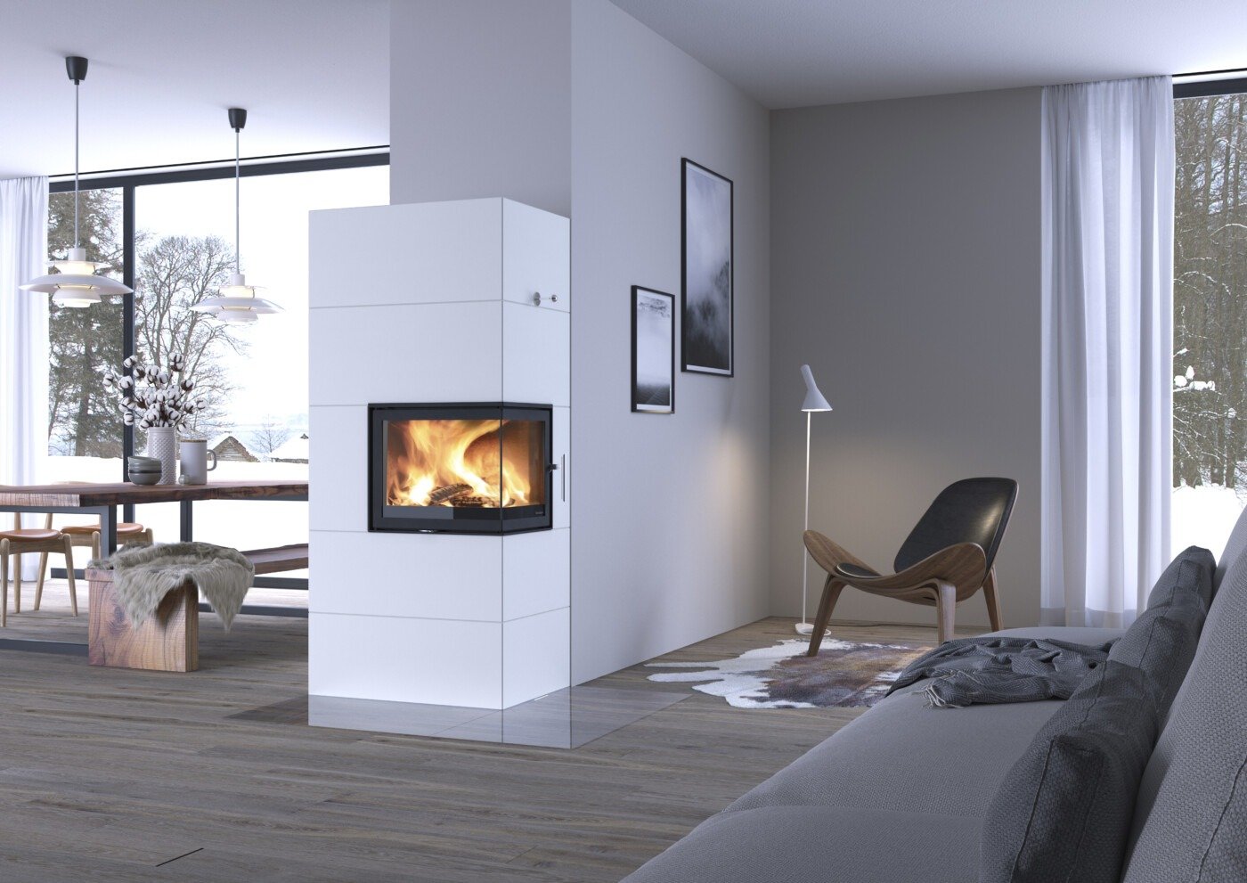 Der Salzburg C kombiniert klassische Speicherofen-Technik mit einer großzügigen Ecksichtscheibe. Dadurch entsteht ein besonders intensiver Blick auf das Feuer, während der massive Speicherkern für langanhaltende Strahlungswärme sorgt.